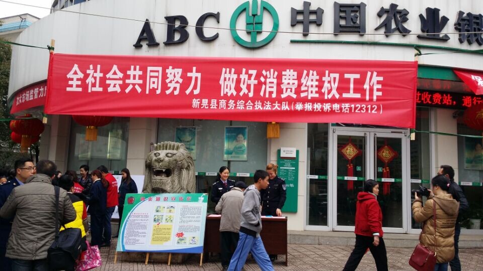 此外,新晃县商务局、工商局、质监局、食监局、烟草局、盐业公司、电力公司等多个部门和企业还在农行门口设立假冒伪劣商品展示台和咨询台。