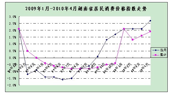 6、居民消费价格继续回升,食品和居住类价格涨幅加大。由于食品价格和居住类价格上涨推动4月份我省居民消费价格走高。1-4月全省物价累计指数上涨1.9%;其中4月份同比上涨2.7%,环比上涨0.4%,涨幅创出自2009年1月份以来的新高。1-4月,八大类商品及服务项目价格全部上涨,其中居住类和食品类价格涨幅最大,分别上涨4.3%和2.9%;4月份,居住类价格上涨6.0%,较上月扩大1.7个百分点;食品类价格上涨4.2个百分点,较上月扩大0.8个百分点。