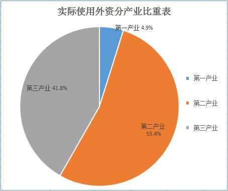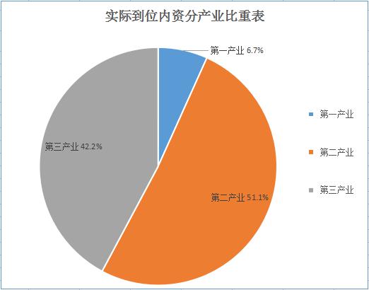 全省一、二、三产业实际使用外资比重为:4.9: 53.4: 41.8;实际到位内资比重为:6.7: 51.1: 42.2。