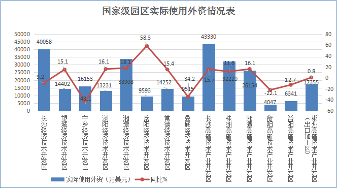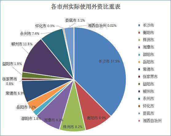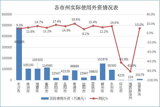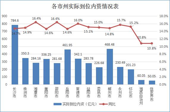 全省吸收外资居前五位的市州是:长沙市(481385万美元)、郴州市(151976万美元)、衡阳市(114560万美元)、湘潭市(105503万美元)、株洲市(105130万美元)。全省内联引资居前五位的市州是:长沙(784.6亿元)、郴州(468.48亿元)、岳阳(461.95亿元)、株洲(350.3亿元)、常德(342.1亿元)。