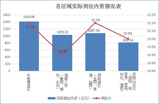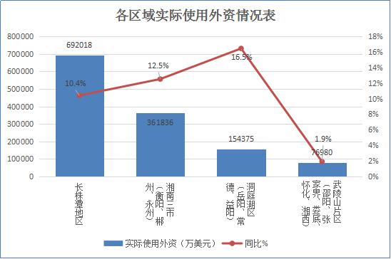 长株潭和湘南三市实际使用外资和实际到位内资分别占全省总额的82%、56.3%。洞庭湖区域吸收内、外资增幅均高于全省平均增幅。受怀化、自治州两个市州外资负增长影响,武陵山片区吸收外资出现了负增长,但内资增幅与全省平均增幅持平。