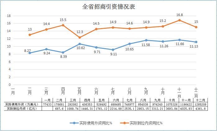 1- 12月(以下除特别说明外,均为1-12月数据),全省招商引资实际到位资金5261.45亿元(按1:7换算),其中,实际使用外资金额128.52亿美元,同比增长11.1%;实际到位内资4361.8亿元,同比增长15%,总体规模实现稳定增长。全省新设立外资企业661个(其中通过备案新设立43家),同比增长17.6 %;合同外资206.36亿美元,同比增长74.5%;有资金到位的内资项目5377个,同比增长9%。