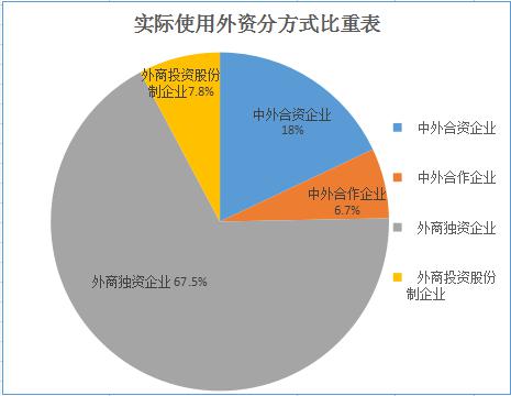 外商独资企业新设企业、合同外资、实际使用外资同比分别增长12.5%、37.6%、18.8%,实际使用外资占全省总额的67.5%,比2015年提高4.3个百分点。中外合资企业、中外合作企业实际使用外资同比分别增长2.1%、23.2%,分别占全省总额的18%、6.7%。外商投资股份制企业到位外资同比下降22.5%,占全省总额的7.8%,比2015年减少3.4个百分点。