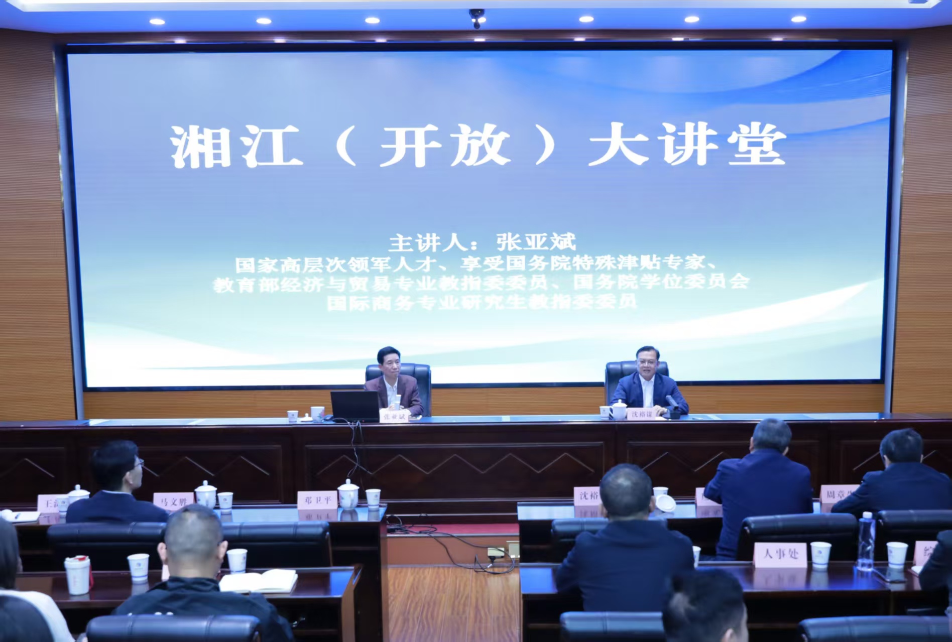 4月22日,湖南省商务厅举办2026年第2期湘江(开放)大讲堂,国家高层次领军人才、享受国务院特殊津贴专家、湖南大学二级教授张亚斌应邀作专题讲座,厅党组书记、厅长沈裕谋主持。