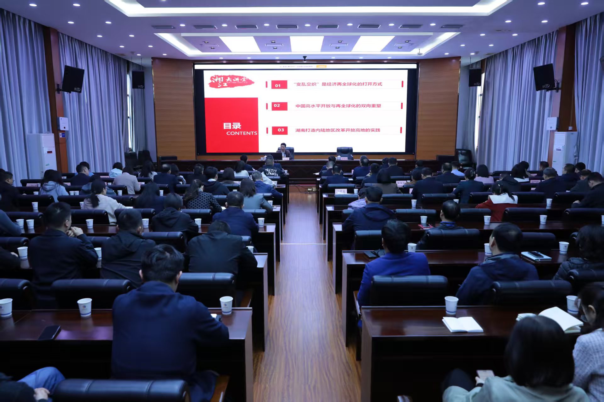 张亚斌教授以“再全球化背景下的中国高水平对外开放”为题,从“‘变乱交织’是经济在全球化的打开方式”,“中国高水平开放与再全球化的双向重塑”和“湖南打造内陆地区改革开放高地的实践”三个方面,深入阐述了“再全球化”的丰富内涵与时代特征,讲座内容系统深刻,案例生动,为全省商务系统干部职工上了精彩的一课,也为湖南打造内陆地区改革开放高地提供了思路和建议。