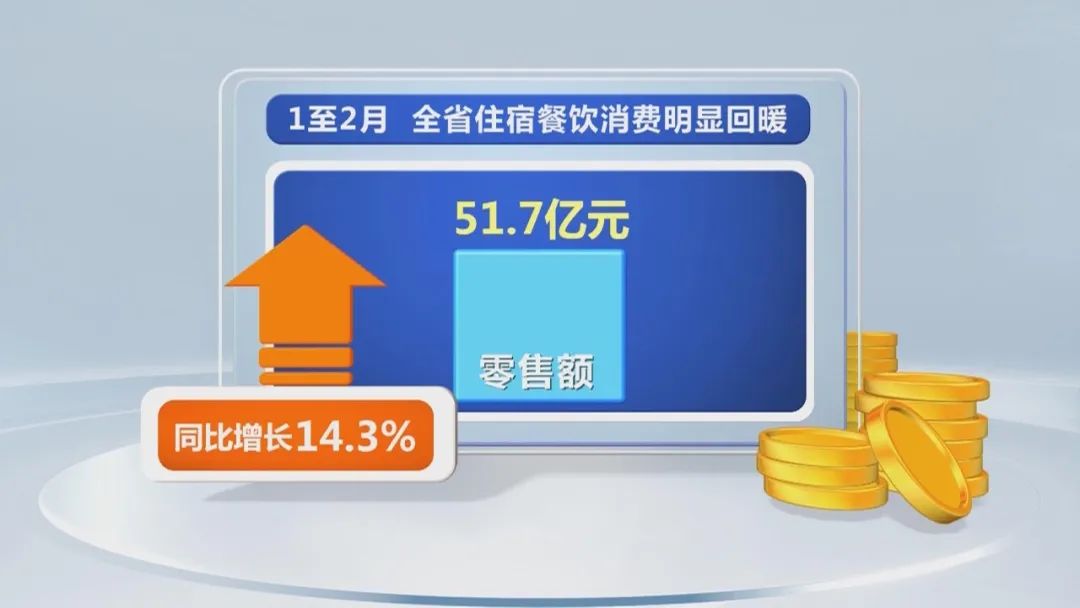 1至2月,全省住宿餐饮消费明显回暖,实现零售额51.7亿元,同比增长14.3%。