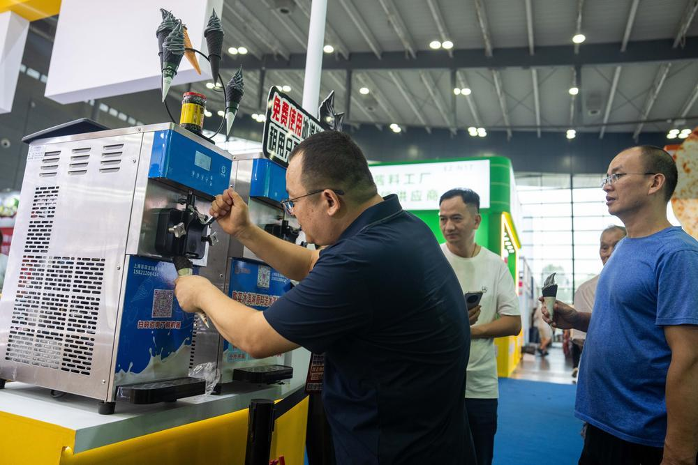 9月19日,在长沙国际会展中心,参展商(左一)在介绍冰淇淋制作设备。 新华社记者 陈思汗 摄