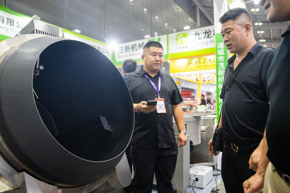 9月19日,在长沙国际会展中心,观众(右)在了解商用炒菜设备。 新华社记者 陈思汗 摄