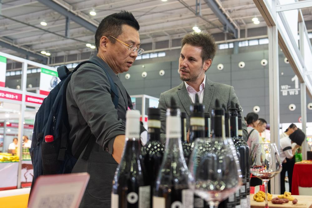 9月19日,在长沙国际会展中心,参展商(右)在介绍展出的红酒。 新华社记者 陈思汗 摄