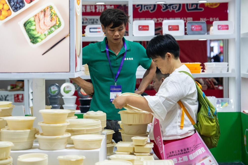 9月19日,在长沙国际会展中心,观众(右)在了解一次性饭盒。 新华社记者 陈思汗 摄