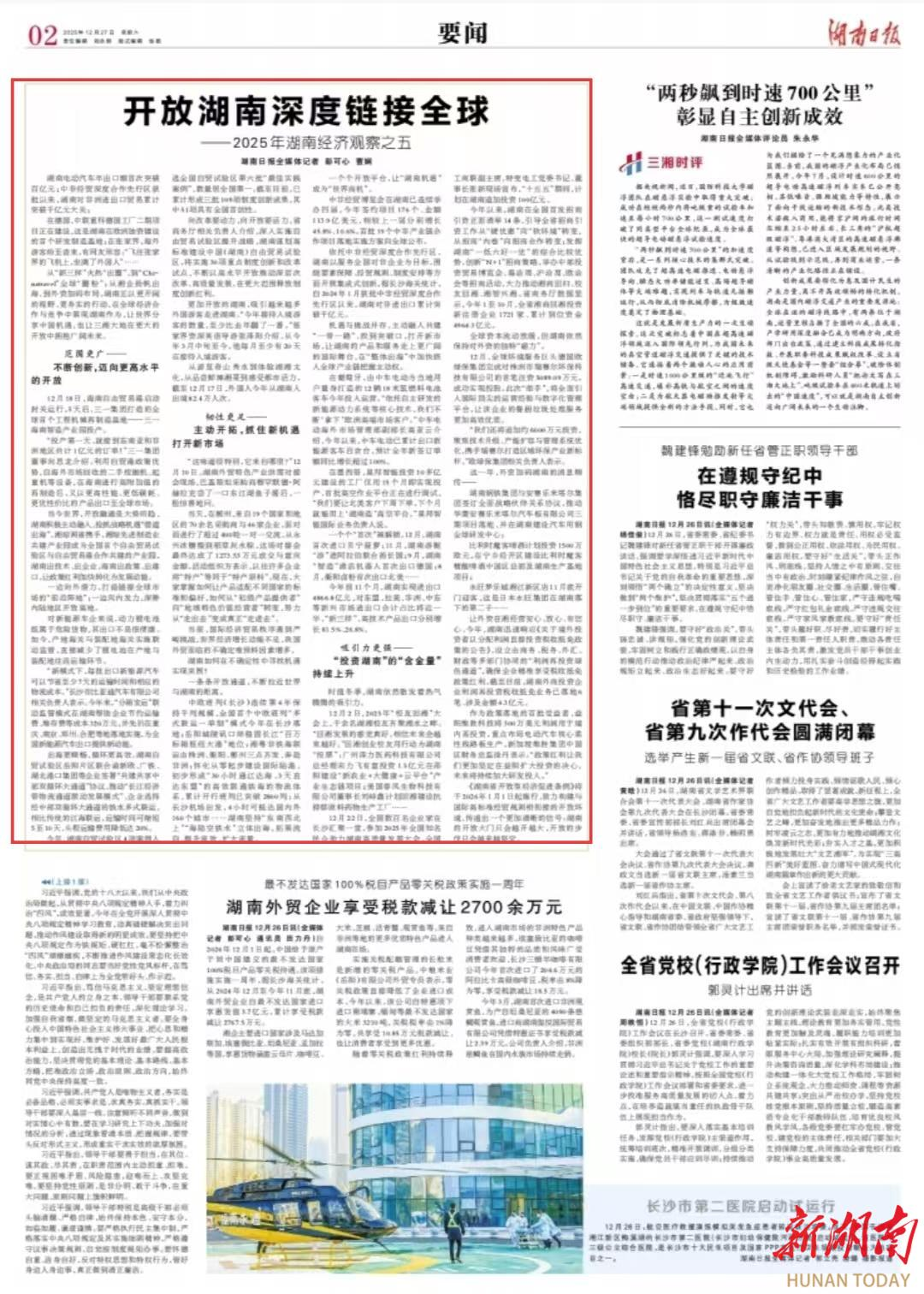 从“新三样”火热“出圈”,到“Chinatravel”全球“圈粉”;从湘企扬帆出海,到外资加码布局,湖南正以更开阔的视野、更务实的行动,在全球经济合作与竞争中展现湖南作为,让世界分享中国机遇,也让三湘大地在更大的开放中拥抱广阔未来。