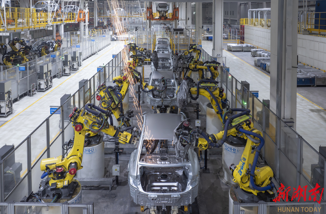 长沙比亚迪雨花基地焊装工厂,智能化生产线上的机械臂伸缩旋转,有条不紊地完成焊接工作。湖南日报全媒体记者 辜鹏博 摄