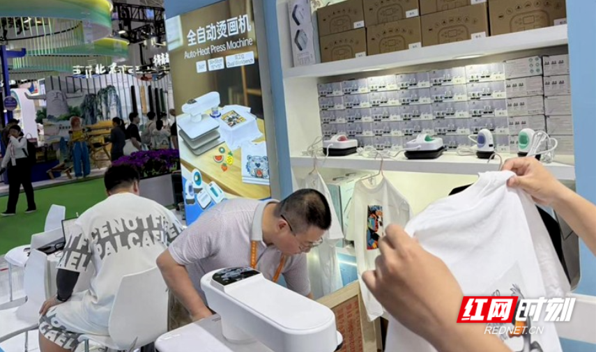 长沙易威吉电子科技有限公司携带全自动烫画机参展,现场展示3分钟在衣服上印图。