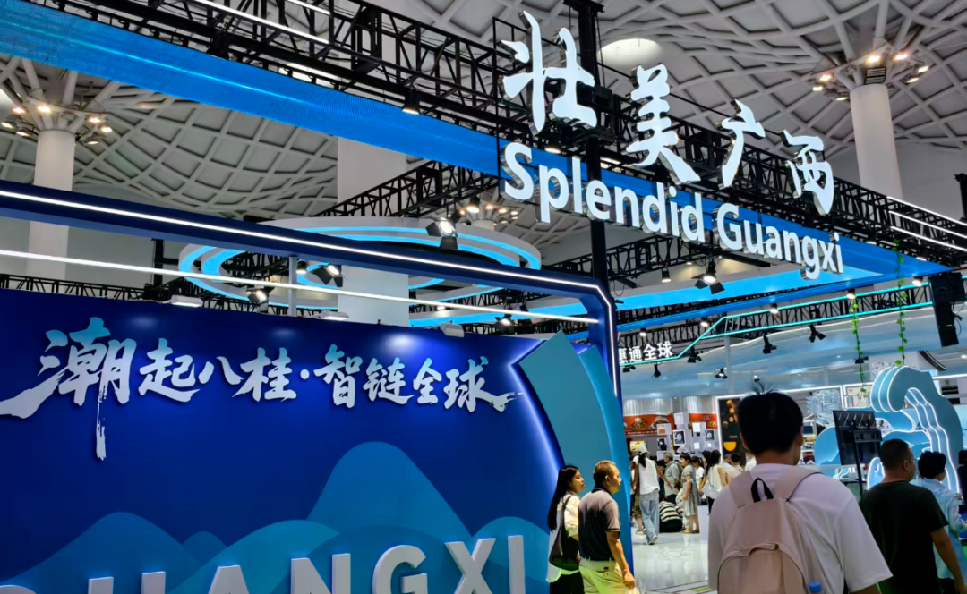 广西展区以“壮美广西”4字打头,旁边8个字“潮起八桂,智链全球”突出科技主题,一目了然。