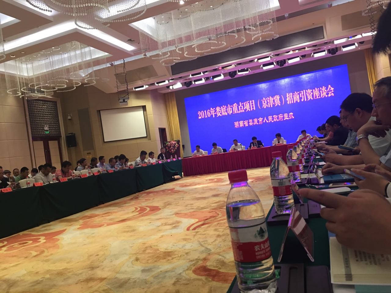 下午,2016娄底市重点项目(京津冀)招商引资座谈会在京召开,来自京津冀的近100名知名客商欢聚一团。会前播放了《一英尺的奇迹》、《梅山情歌》等旅游宣传片,发放了旅游宣传手册,借此座谈会平台成功的宣传了新化旅游。我县邀请了首农集团创投平台、北京三元创业投资有限公司执行总裁江青山先生、北京神州农业科技股份有限公司总经理王志忠先生、北京京翰科技公司董事长卞红斌先生、海绵城市投资股份有限公司董事长徐桂荣先生、海绵城市投资股份有限公司总经理肖小林先生等10余人参加了此次座谈会,借此机会,我县与海绵城市投资股份有限公司达成海绵城市建设和大洋江航电枢纽项目合作意向;与首农集团创投平台对接吉庆牡丹产业园和文化旅游项目;与唐宫海鲜对接职业教育培训项目;与中国联华科技股份有限公司对新化飞机场项目达成合作意向。