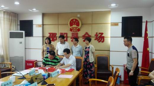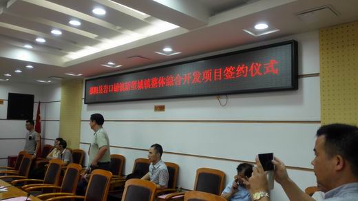 2015年5月27日上午,邵阳县岩口铺镇新型城镇整体综合开发项目签约仪式在县政府常务会议室隆重举行,中共邵阳县委副书记、县人民政府县长袁玉华与中铁金龙城镇建设开发有限公司董事长于长安先生在合同书上分别签署了自己的名字。出席签约仪式的有中共邵阳县委副书记曾梅林、县人大常委副主任邓星强、罗立华、县人民政府副县长胡迪芬、唐荣贵、县政协副主席吕平等县领导和岩口铺镇党委、政府主要领导以及商务、财政、发改、住建、规划、国土、环保、政务中心等单位负责人。