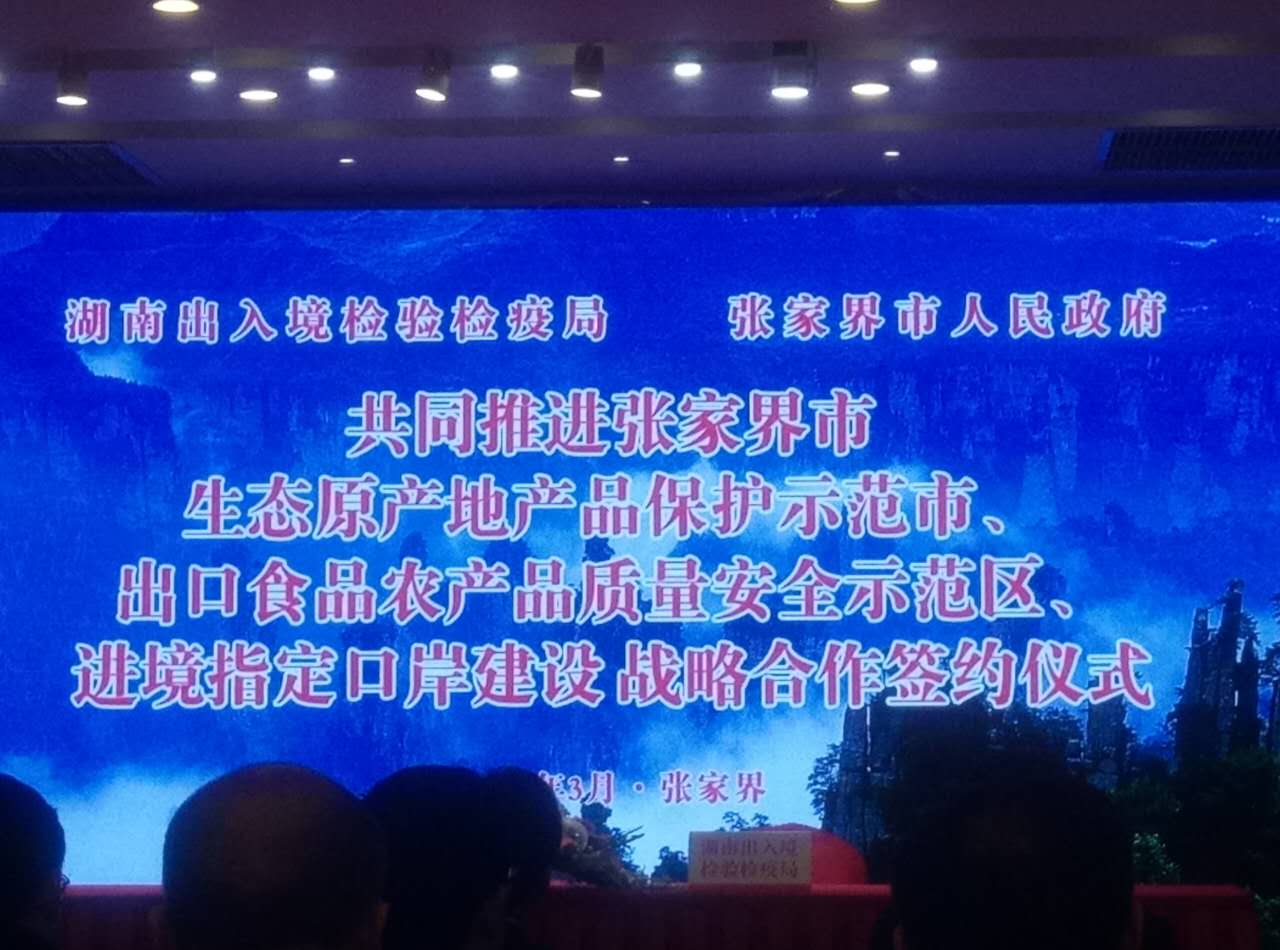 张家界地处武陵山片区核心位置,优势独特,资源丰富,张家界市政府将履行建设主体责任,以生态原产地产品保护示范市、出口食品农产品质量安全示范区和指定口岸建设为契机,挖掘利用好独特的地理优势,提高张家界生态原产地产品的知名度、美誉度和开放度,用好荷花机场一类航空口岸的优势,全面提升张家界市食品农产品质量安全水平,促进食品农产品出口。湖南出入境检验检疫局将在法律框架下和职权范围内给予全力支持和帮助,促进张家界市生态原产地产品保护示范市和出口食品农产品质量安全示范区等相关示范区和进境指定口岸建设。