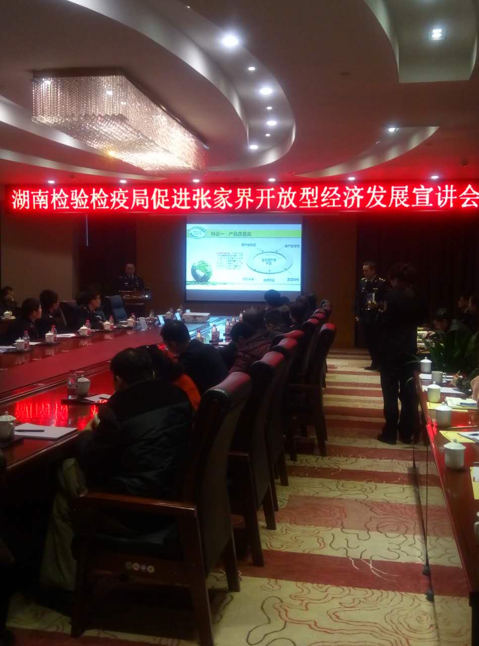 签约前,虢正贵书记接见了杨杰局长一行,并就张家界开放经济发展进行了座谈。湖南出入境检验检疫局还组织了“促进张家界市开放型经济发展”专题宣讲会,张家界市直相关单位、区县政府和进出口企业负责人参会学习。(张家界市口岸办)