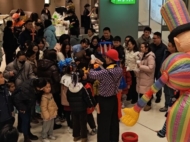 北辰荟内,小丑气球巡游“圈粉”无数。张埕 摄