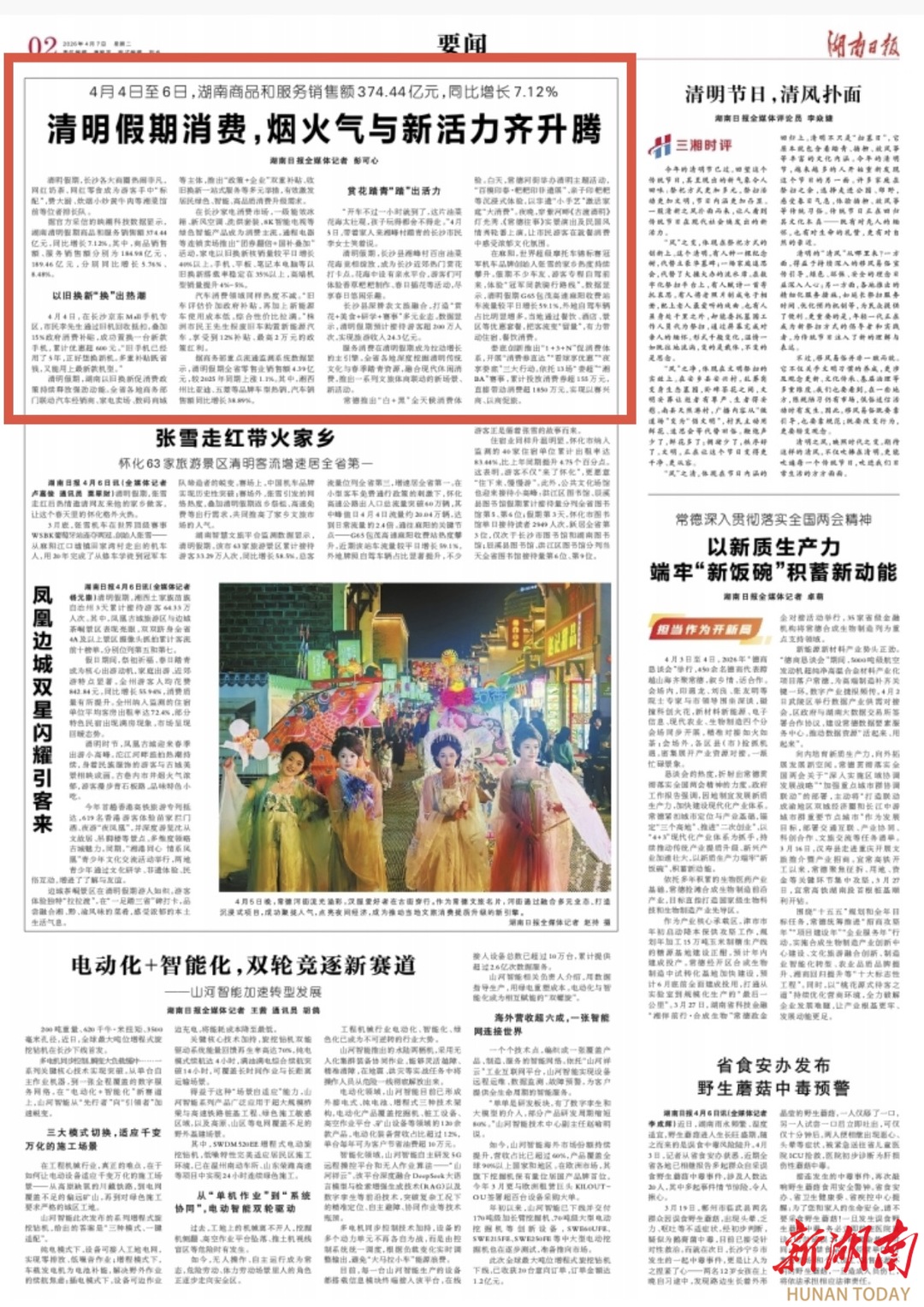 在麻阳,世界超级摩托车锦标赛冠军机车品牌创始人张雪的家乡热度持续攀升。假期不少车友、游客专程自驾前来,体验“冠军同款骑行路线”。数据显示,清明期间G65包茂高速麻阳收费站车流量较平日增长59.1%,外地自驾车辆占比明显增多。当地通过餐饮、酒店、景区等优惠套餐,把客流变“留量”,有力带动住宿、餐饮消费。